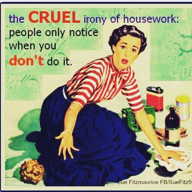 Alas! The goal of a spotlessly clean house with a place for everything and everything in its place, even in the garage and basement, continues to elude me. So I especially love the abundance of housekeeping memes that remind me I’m not alone in my never-ending struggle.