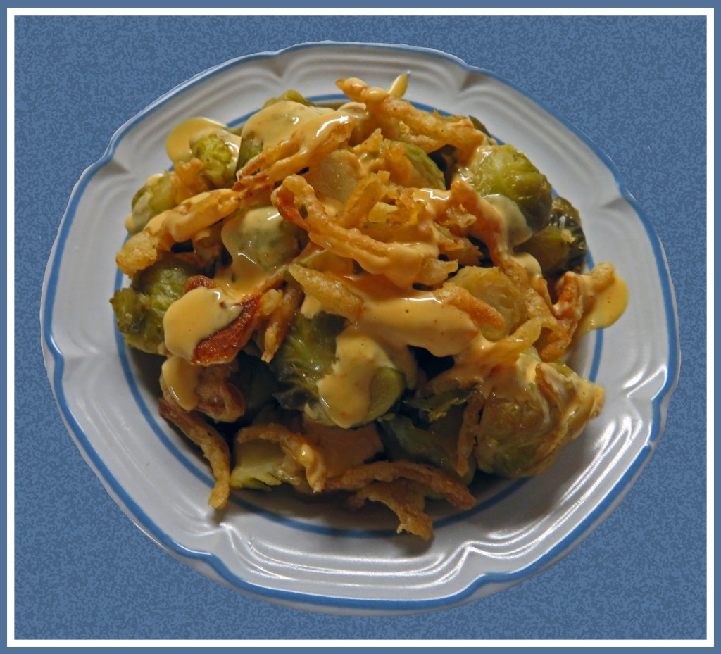 When Brussels sprouts are nearly browned, top with french fried onion rings and bake about 5 more minutes until onion rings are browned and crisp.