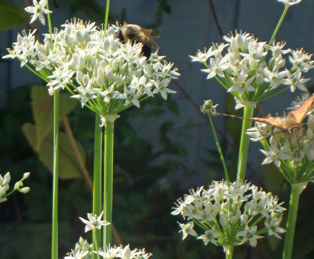 We’ve been adding pollinator-friendly perennial flowers and herbs little by little each year. Here, a butterfly and bee (you can see them both if you look close) feast on some blooming chives.